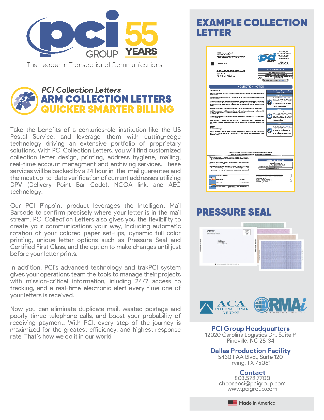 Through our collection letters print and mail services, PCI Group empowers your team with mission-critical information and robust intelligent workflow solutions, that confirm to strict state and federal regulations managed by your business rules, and complies to the Fair Debt Collection Practices Act (FDCPA).