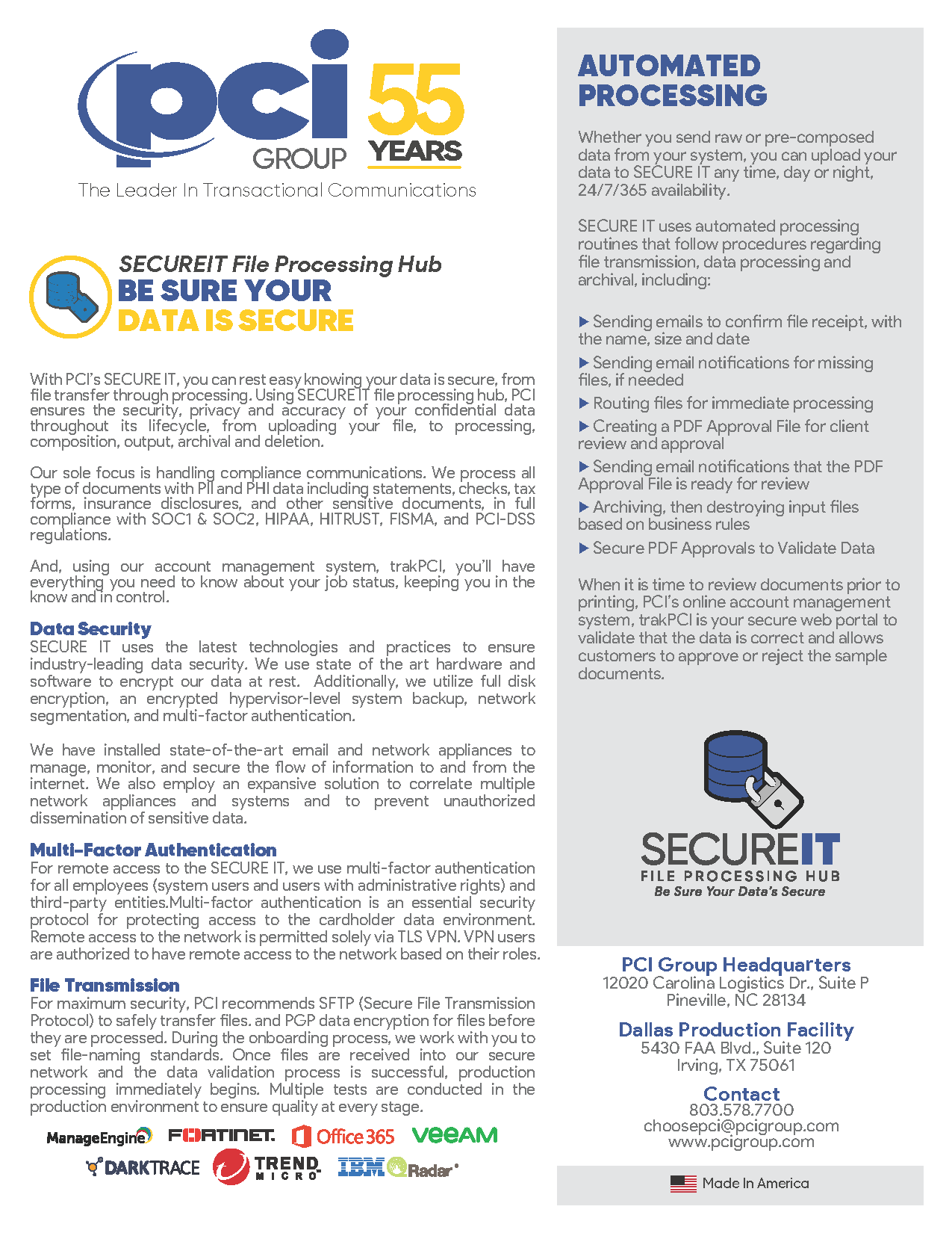 With PCI’s SECURE IT, you can rest easy knowing your data is secure, from file transfer through processing. Using SECURE IT file processing hub, PCI ensures the security, privacy and accuracy of your confidential data throughout its lifecycle, from uploading your file, to processing, composition, output, archival and deletion.